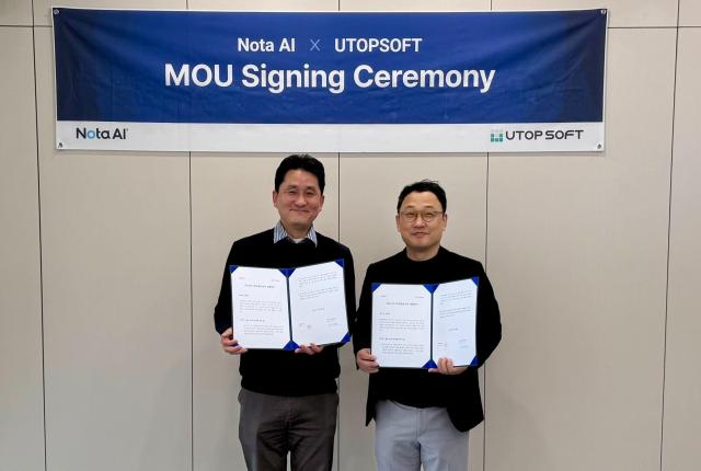 노타 양석열 이사(왼쪽)와 유탑소프트 김성범 대표이사(오른쪽)가 삼성동 노타 오피스에서 열린 양해각서(MOU) 체결식에서 기념촬영을 하고 있다.[사진=노타]