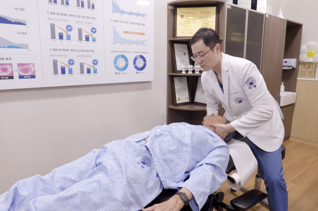 잠실자생한방병원 김석환 원장에게 추나요법을 받고 있는 리차드 민[사진=자생한방병원]