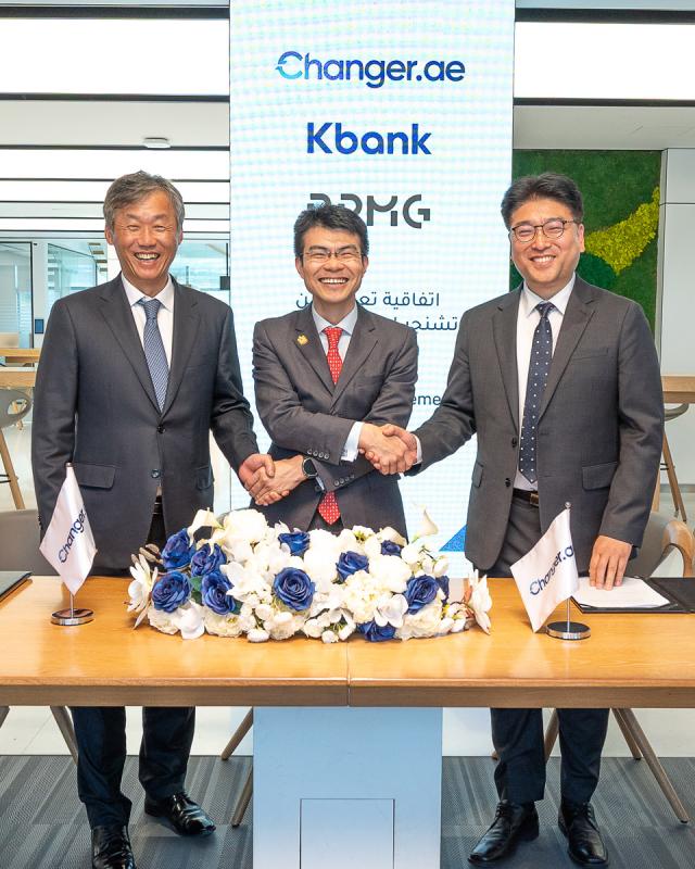 (왼쪽부터) 최우형 케이뱅크 은행장과 왕하오(Wang Hao) 체인저 부대표, 문범영 비피엠지 개발실장이 지난달 아랍에미리트 아부다비에서 진행된 업무협약식에서 기념 촬영하는 모습 [사진=케이뱅크]